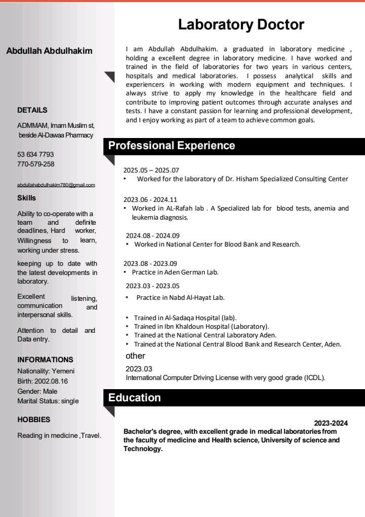 طبيب مختبر أنا عبد الله عبد الحكيم خريج طب المختبرات حاصل على درجة امتياز في طب المختبرات عملت وتدربت في مجال المختبرات لمدة عامين في مراكز ومستشفيات ومختبرات طبية مختلفة. امتلك مهارات تحليلية وخبرة في العمل مع المعدات والتقنيات الحديثة. أسعى دائما لتطبيق معرفتي في مجال الرعاية الصحية والمساهمة في تحسين نتائج المرضى من خلال التحليلات والاختبارات الدقيقة. لدي شغف دائم بالتعلم والتطوير المهني