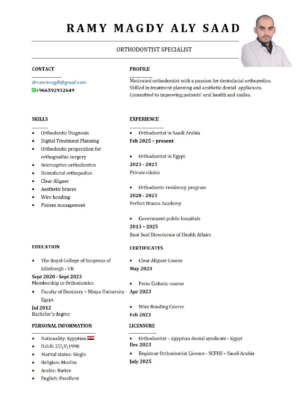 دكتور رامي مجدي علي سعد - مصري - طبيب تقويم الأسنان - تصنيف نائب (تحديث التصنيف لنائب أول خلال أيام) خبرة 5 سنوات - ابحث عن نقل كفالة في السعودية