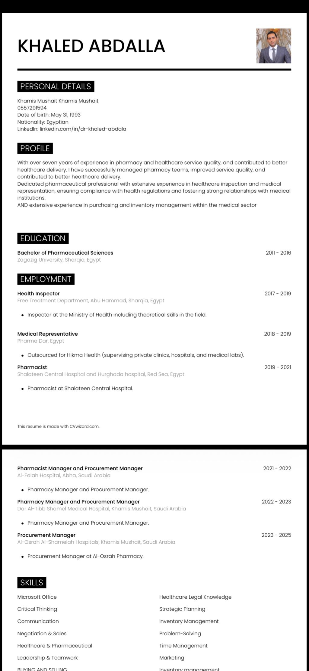 صيدلي خبرة 5 سنوات داخل المملكة مدير صيدليات ومدير مشتريات إقامة سارية ورخصة عمل سارية