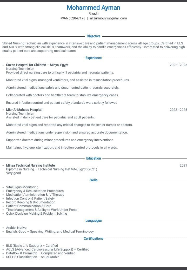 ممرض مصري داخل السعودية خريج المعهد الفني للتمريض، خبرة في تمريض الاطفال وحديثي الولادة، العناية المركزة، كبار السن، الاستقبال والطوارئ. حاصل على BLS وACLS، مجتاز البرومترك والداتا فلو. جاهز للعمل فورا، اعمل تحت ضغط وبالتزام كامل بمعايير السلامة والجودة