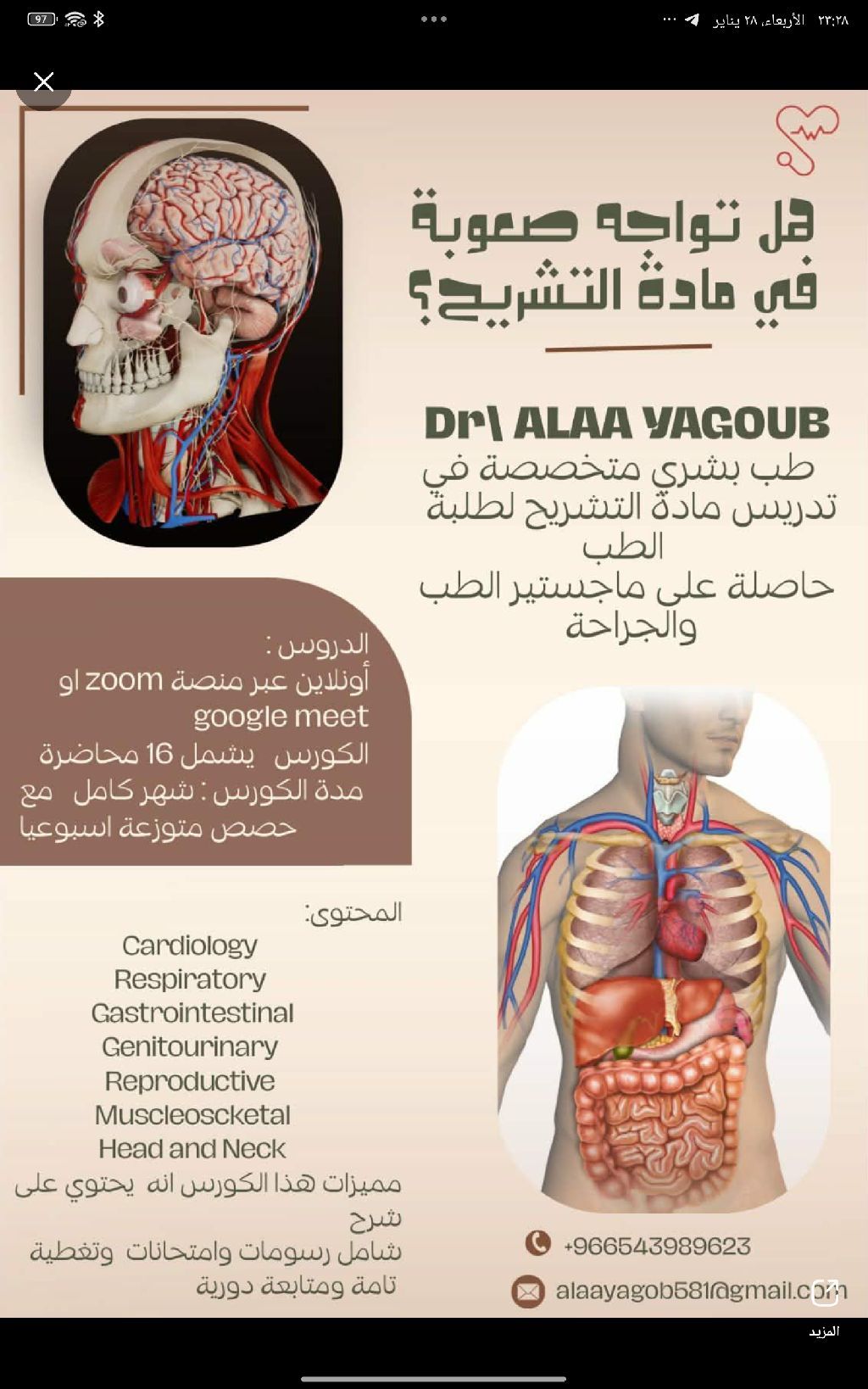 طبيبه متخصصه تمتلك خبرة في تدريس طلبه الطب قسم أل Anatomy، حاصله على درجه البكالوريوس والماجستير في الطب والجراحة، ابحث عن فرص تدريس في الجامعات أو دراسة اونلاين لطلبه الطب. ذات مهارات تواصل عالية وقدرة على تبسيط المعلومات. للتواصل يرجى الاتصال بالرقم أعلاه