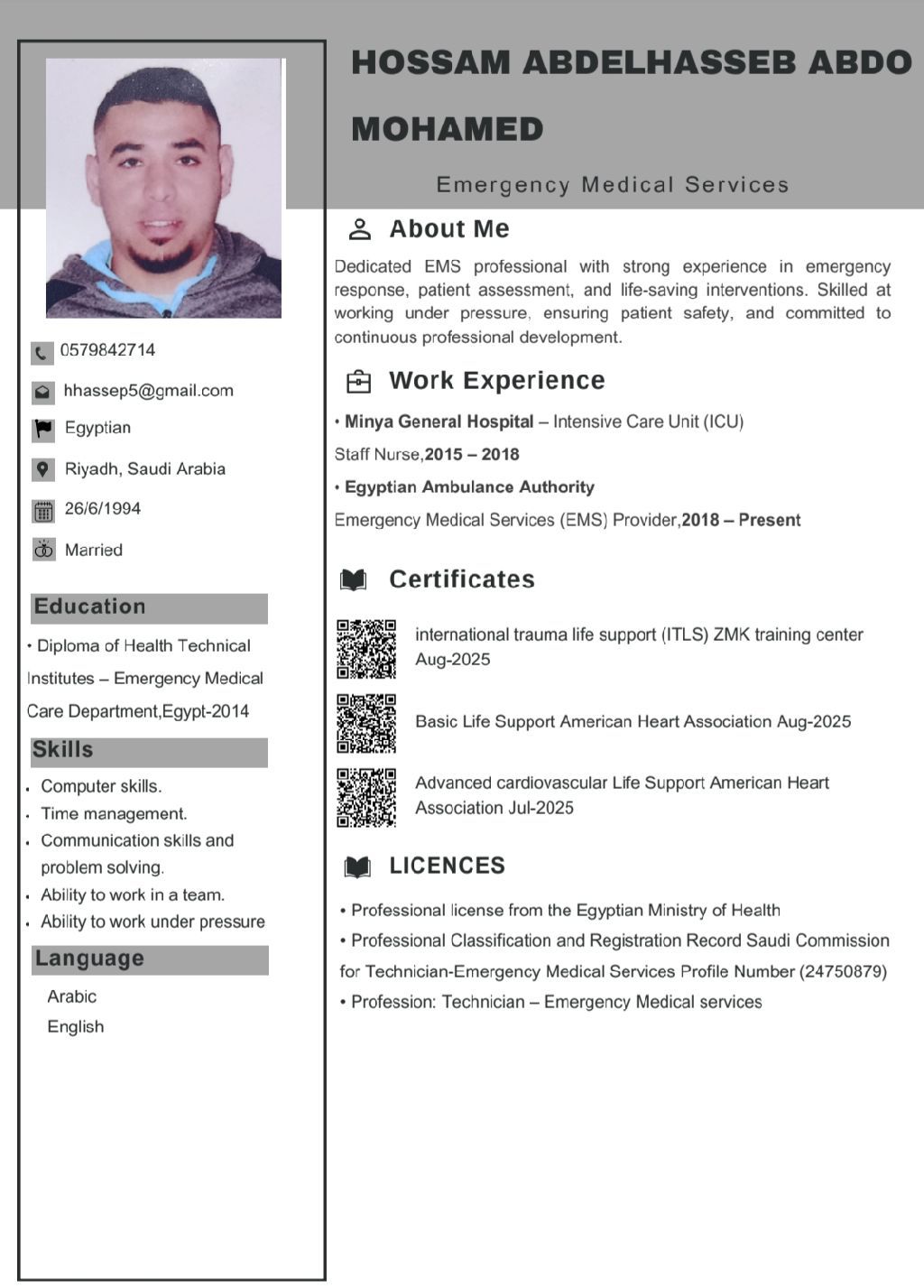 فني خدمات طبية عاجله خبرة 6 سنوات في هيئة الاسعاف المصريه ابحث عن عمل في أي مكان داخل المملكة