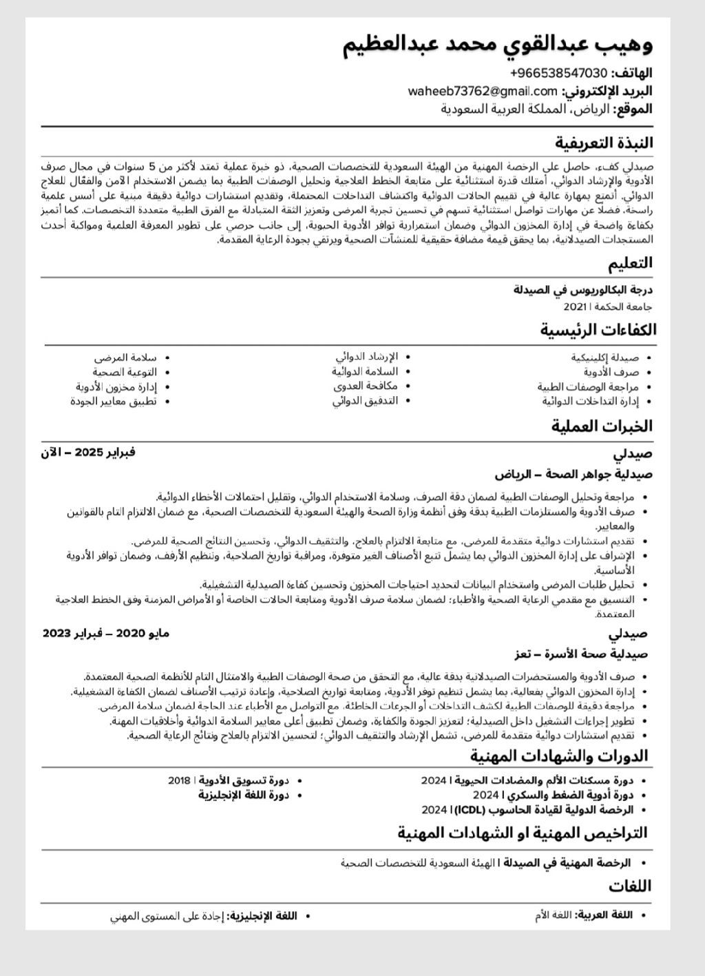 صيدلي يمني خبرة سنتين في السوق السعودي ترخيص ساري وإقامة سارية جاهز للنقل الكفالة والمباشرة الفورية مهارة عالية في إدارة الطلبيات وتحقيق المستهدف البيعي وتطوير مبيعات الصيدلية