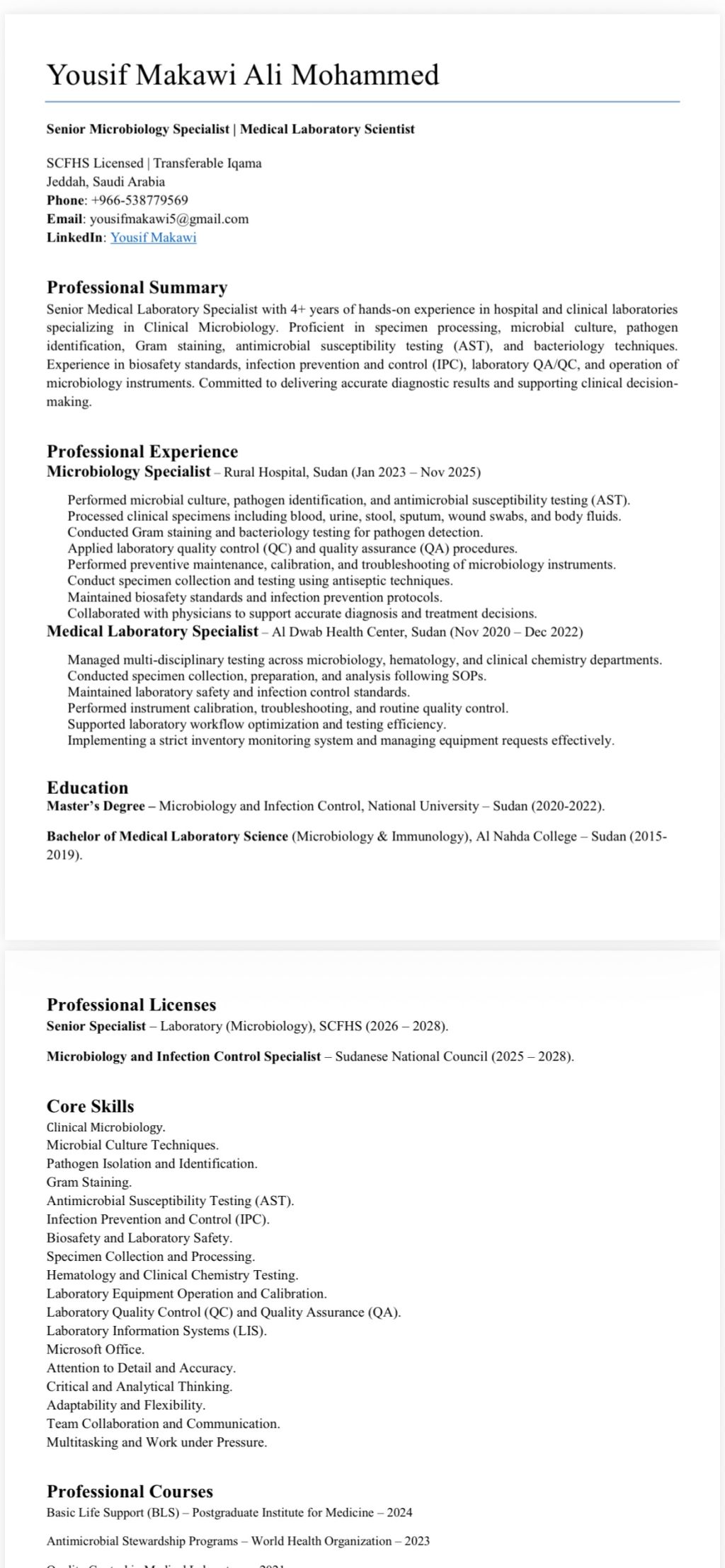 اختصاصي مختبرات طبية (أحياء دقيقة) بخبرة تتجاوز 4 سنوات. إقامة سارية وترخيص ساري ابحث عن فرصة عمل مناسبة في جميع أنحاء المملكة