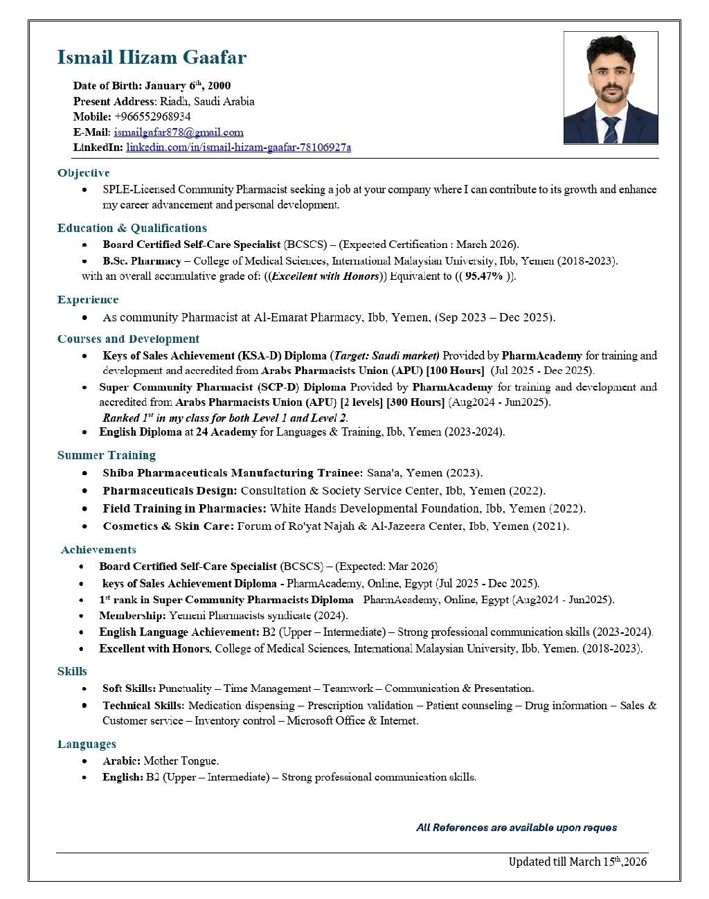 صيدلي - صيدلاني مرخص في السعودية، حاصل على بكالوريوس صيدلة (ممتاز مع مرتبة الشرف) وبورد أمريكي في صيدلة المجتمع (BCSCS) الأول على دبلوم Supper Community Pharmacists (SCP) الأكبر في الشرق الأوسط والمعتمد من اتحاد صيادلة العرب، وحاصل على دبلوم Keys of Sales Achievement (KSA) المعتمد من اتحاد صيادلة العرب، خبرة سنتين في صيدلية مجتمع في اليمن. ابحث عن بيئة عمل محفزة للنمو والتطوير المهني