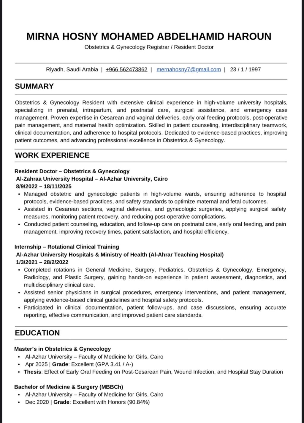 طبيبة نساء وتوليد مصرية حاصلة على الماجستير بتقدير امتياز من جامعة الأزهر، وشغلت منصب نائبة مقيمة بمستشفى جامعة الأزهر، حاصلة على التصنيف المهني من الهيئة السعودية للتخصصات الصحية، مقيمة في الرياض ومتاح نقل كفالة