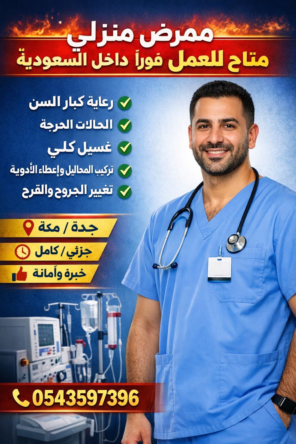 ممرض منزلي خبرة متاح للعمل فورا داخل السعودية ممرض خبرة أكثر من 5 سنوات في مجال التمريض المنزلي، متخصص في رعاية كبار السن التعامل مع الحالات الحرجة غسيل الكلي تركيب المحاليل واعطاء الادوية تغيير الجروح والقرح التعامل مع اجهزة التنفس والشفط ملتزم - أمين - خبرة عملية قوية - تعامل راقي مع المرضى متواجد حاليا في (جدة / مكة) متاح للعمل فورا (جزئي / كامل / حالات)