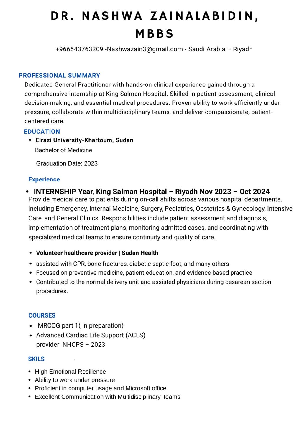This is Dr Nashwa zain a GP doctor in Riyadh I am interested in insurance Medical group if there is available vacancy that could be matching with my qualification