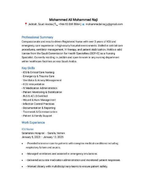 ممرض مرخص من الهيئة السعودية للتخصصات الصحية وخبرة في العناية المركزة والطوارئ لأكثر من 3 سنوات ابحث عن عمل في أي مكان في السعودية