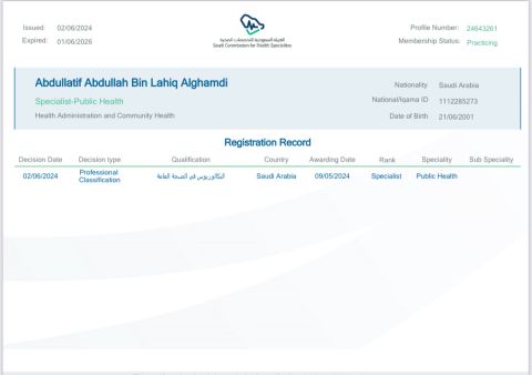 عبد اللطيف الغامدي متخرج بدرجة البكالوريوس من جامعة الباحة قسم الصحة العامة لقد تم تدريبي لمدة سنة في ثلاث منشاءات وهيا مستشفى بمعدل 6 في أربعة أقسام في التغذية ومكافحة العدوى والصحة العامة والتوعية الصحية وثلاثة أشهر في الامانة قسم صحة البيئة وثلاثة أشهر في مركز رعاية أولية في قسم الطب الوقائي تعلمت خلالها الكثير