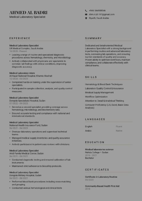 أخصائي أول مختبر طبي خبرة ادارة المختبر لدي خبرة أكثر 9 سنوات في المختبرات الطبية حاصل على تصنيف الهيئة السعودية للتخصصات الطبية إقامة قابلة بالنقل