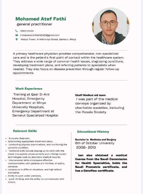 طبيب عام خبرة 4 سنوات في مجال الطب العام والطوارئ - إقامة قابلة للنقل + ترخيص الهيئة السعودي متاح للعمل فورا في أي منطقة من مناطق المملكة