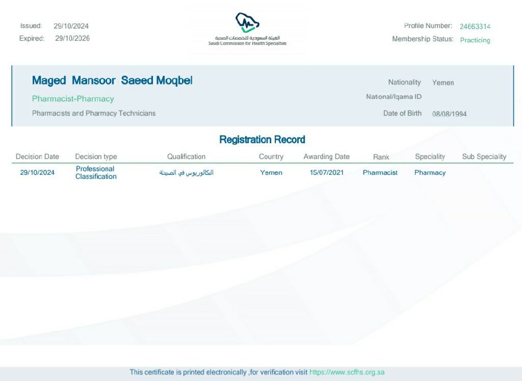 صيدلاني يمني مرخص من قبل الهيئة السعودية للتخصصات الصحية لدي خبرة تمتد أكثر من 4 سنوات في مجال الصيدليات ولدي خبرة في مستلزمات التجميل ابحث عن عمل في أي منطقة من مناطق المملكة العربية السعودية اتمنى التواصل في حالة الحاجة للصيدلي ولكم مني جزيل الشكر والتقدير