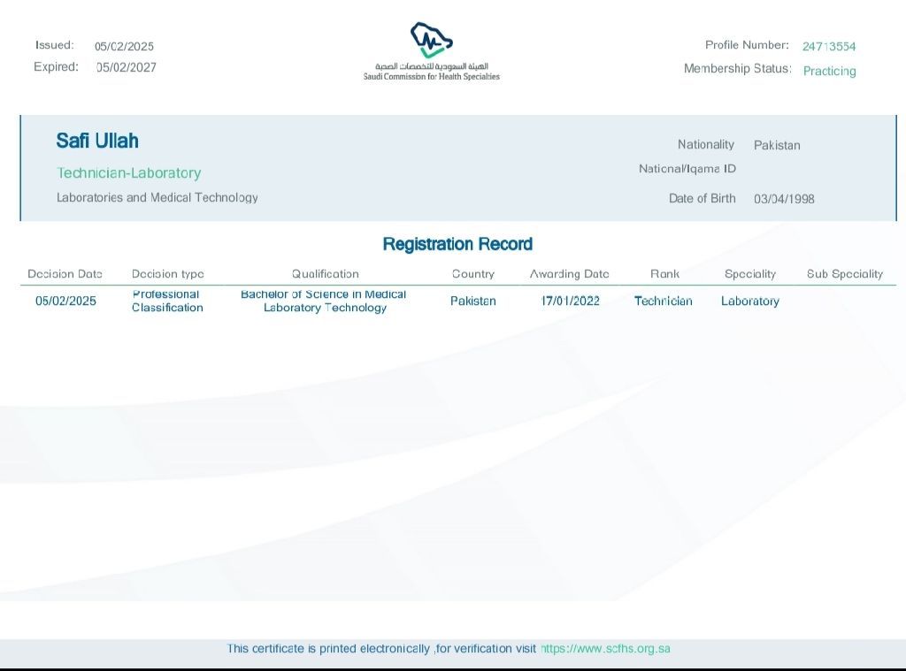 Medical Laboratory Technician (SCFHS Licensed) I have completed bachelor degree in medical laboratory technology Dedicated and skilled Medical Laboratory Technician with 3 years of professional experience, including 2 years in histopathology and 1 year in general laboratory procedures. Licensed by the Saudi Commission for Health Specialties (SCFHS)