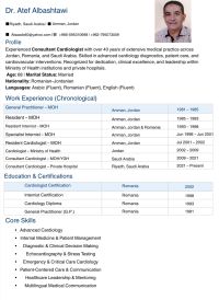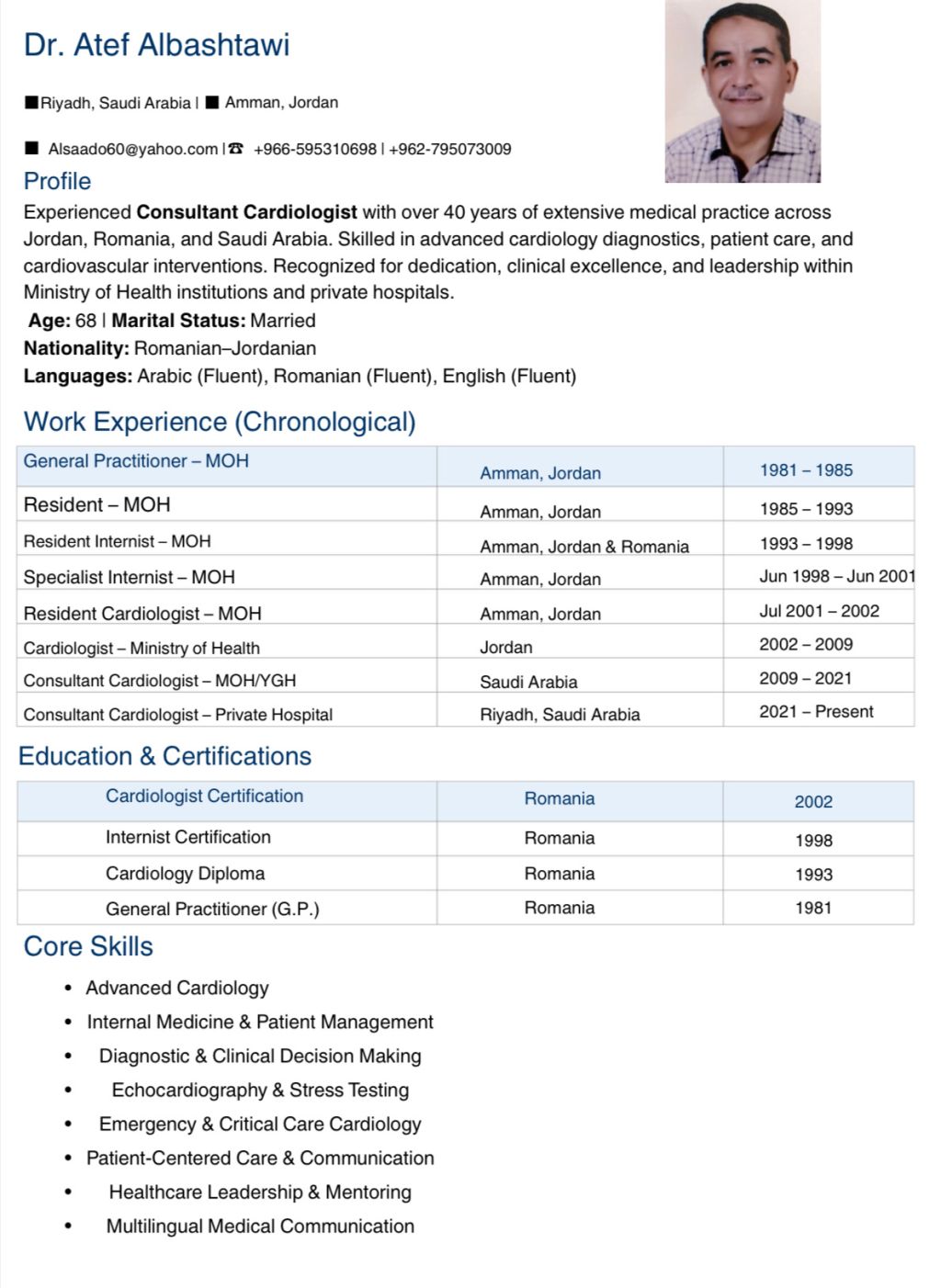 استشاري أمراض القلب، أرغب بالانضمام الى فريق عملكم الموقر كمستشار لأمراض القلب. أقيم حاليا في المملكة العربية السعودية - الرياض، وامتلك خبرة مهنية تمتد لأكثر من عشر سنوات في مجال أمراض القلب والتعامل مع الحالات المتنوعة. أتطلع الى فرصة للتعاون معكم والمساهمة بخبرتي في تقديم رعاية طبية متميزة وفق أعلى معايير الجودة والاحتراف. مع خالص التقدير والاحترام، د عاطف البشتاوي