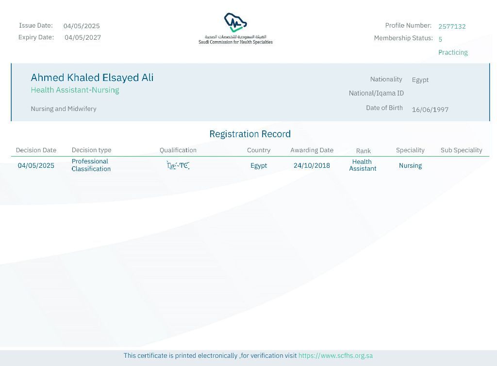 I am Ahmed Khaled, a nursing technician with a valid Prometric license from the Saudi Commission for Health Practitioners. I have two years of experience in the field of central emergency departments. I have six years of experience in the field of intensive care. I have two years of experience in the field of psychiatry and addiction. I have completed ACLS/ BlS training courses. I am looking for