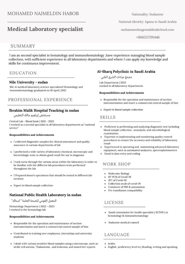 أنا محمد نجم الدين، أخصائي مختبرات طبية أمراض دم ومناعة، ومرخص من الهيئة السعودية للتخصصات الصحية خبرة 4 سنوات