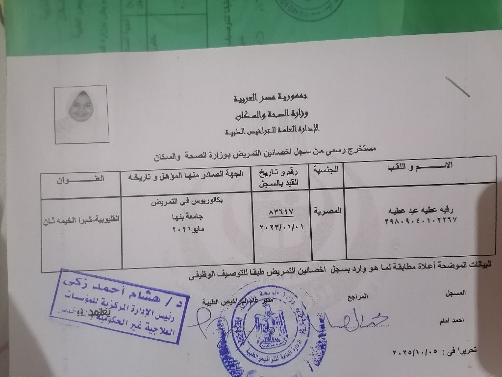 Rokaya Attia Eid graduated in 2022 as a nursing specialist from Benha University. She worked at 57357 Hospital in the intensive care unit for two years and four months, and at Sednawy Hospital in the intensive care unit. She holds BLS and ACLS certificates in infection control
