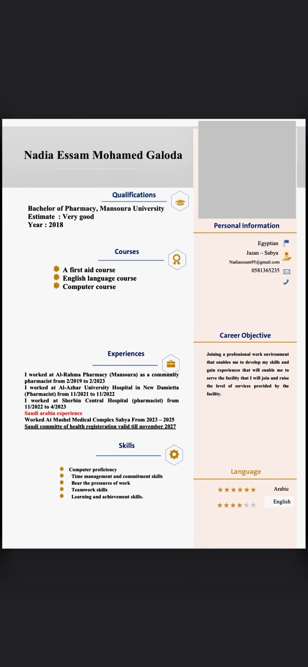 صيدلانية مصرية خبرة 5 سنوات في مصر وسنتين في مجمع طبي في جازان في السعودية خبرة في التركيبات الدوائية وصرف الادوية والعمل تحت الضغط جاهزة لنقل الكفالة حاليا في فترة الاشعار اعمل حاليا في مجمع طبي في صبيا ابحث عن فرصة عمل في خميس مشيط أو أبها أو أحد رفيدة نظرا لانتقال زوجي هناك