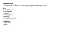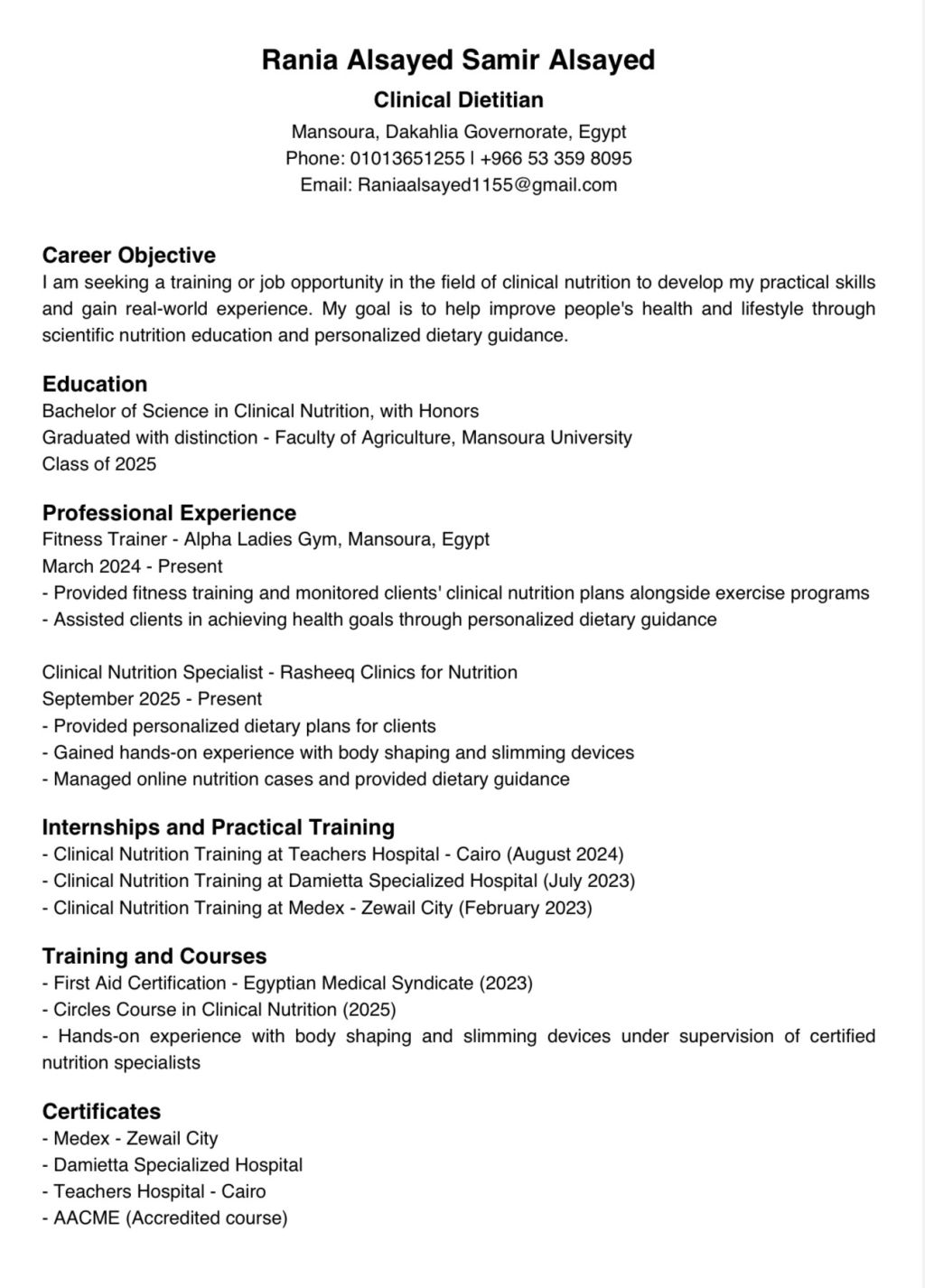 Clinical Dietitian - Recent graduate from Al Mansoura University. Completed practical training at accredited hospitals and nutrition centers (Zewail Medix - Damietta Hospital - Teachers Hospital in Cairo) Participated in volunteer work at 57357 children’ Cancer Hospital. Currently based in Riyadh and seeking a job opportunity in the field of Clinical Nutrition. Available to start immediately
