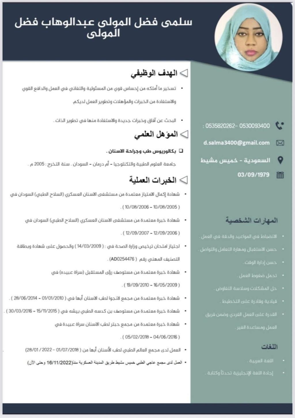 طبيبة أسنان عامة ذو خبرة طويلة في جنوب المملكة مع إقامة قابلة للنقل