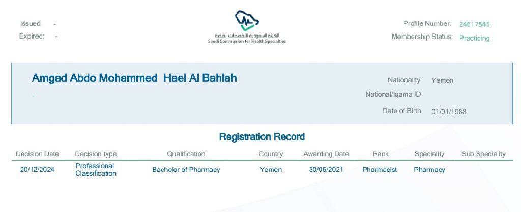 صيدلاني مرخص للعمل في السعودية العمر 27 سنة الجنسية يمني