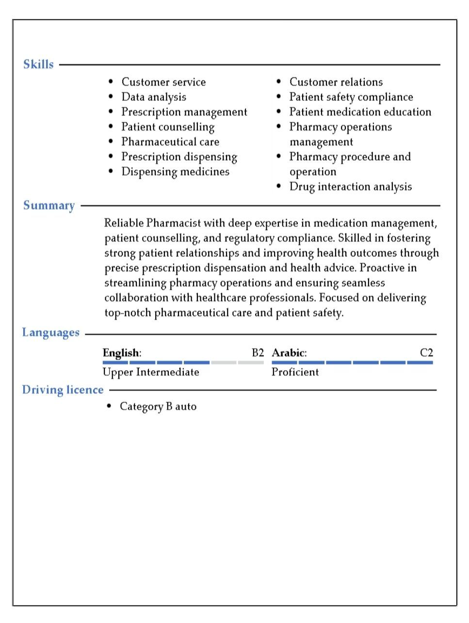 I am Dr. Haroun Al - Soufi, a Yemeni pharmacist residing in Saudi Arabia, graduated 2023 with a 94.24% GPA, licensed by the Saudi Commission for Health Specialties. Experienced as a practicing pharmacist and former pharmacology trainer, I am seeking a pharmacy position in any city in Saudi Arabia