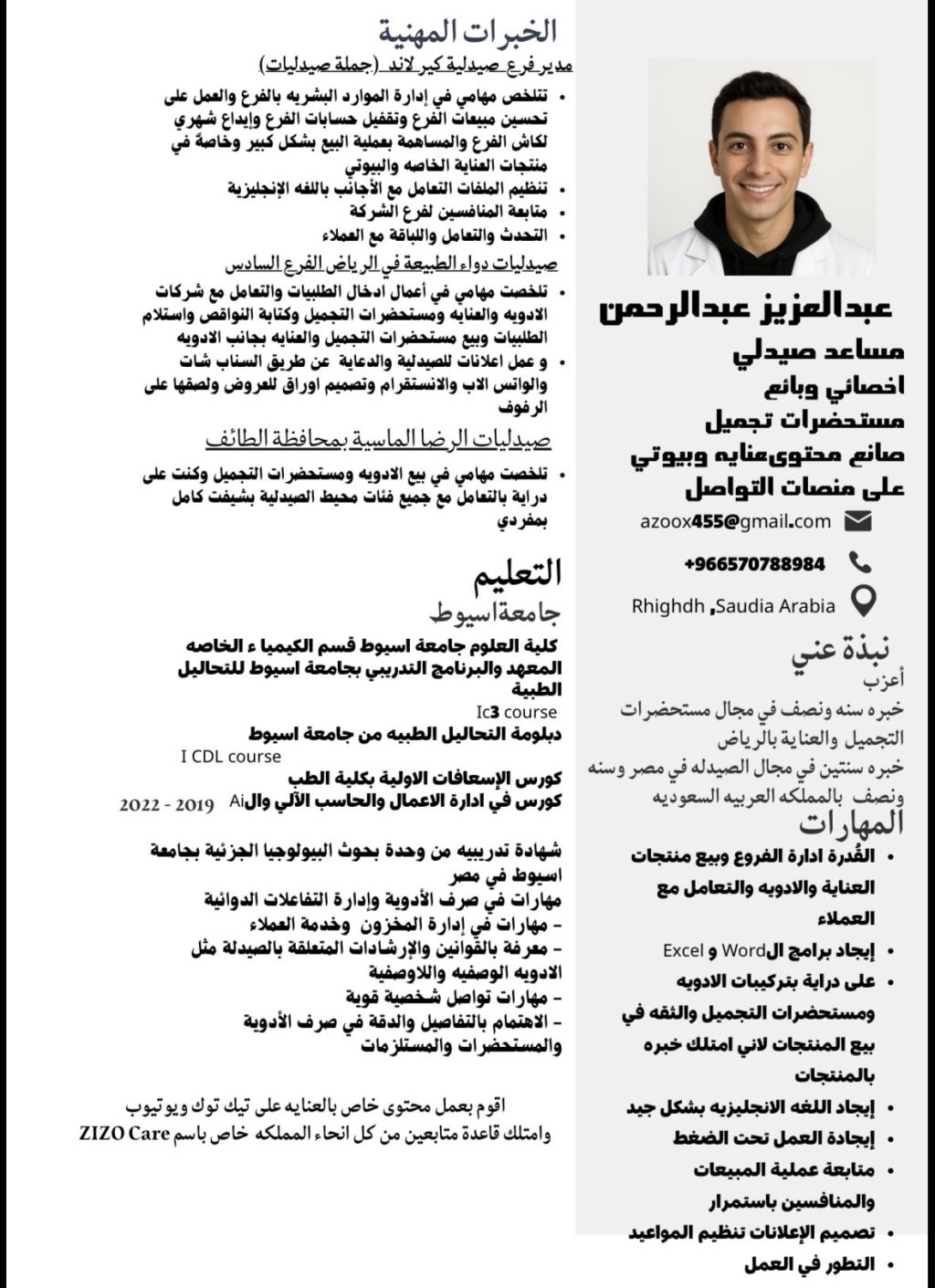 أخصائي مستحضرات تجميل Beauty advisor خبرة سنتين في السعودية في مجال مستحضرات التجميل والادوية والفيتامينات وصانع محتوى خاص في العناية