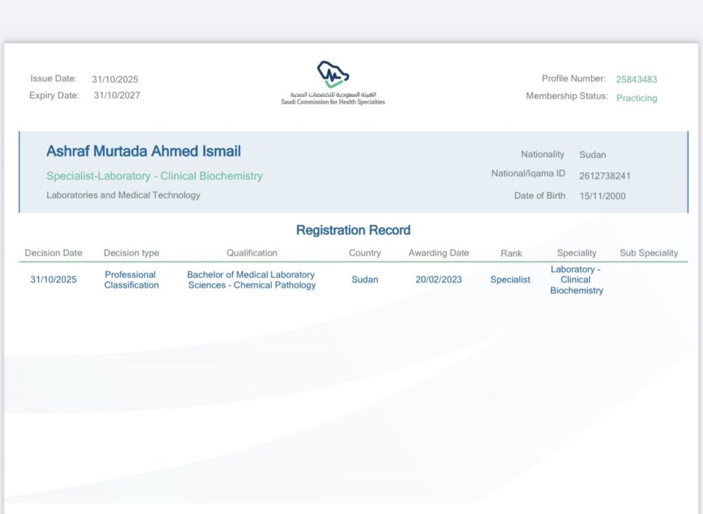 أشرف مرتضى أحمد اسماعيل أخصائي مختبر سوداني الجنسية العمر 25 سنة لدي تصنيف من الهيئة السعودية وساري الإقامة السكن الرياض الدار البيضاء