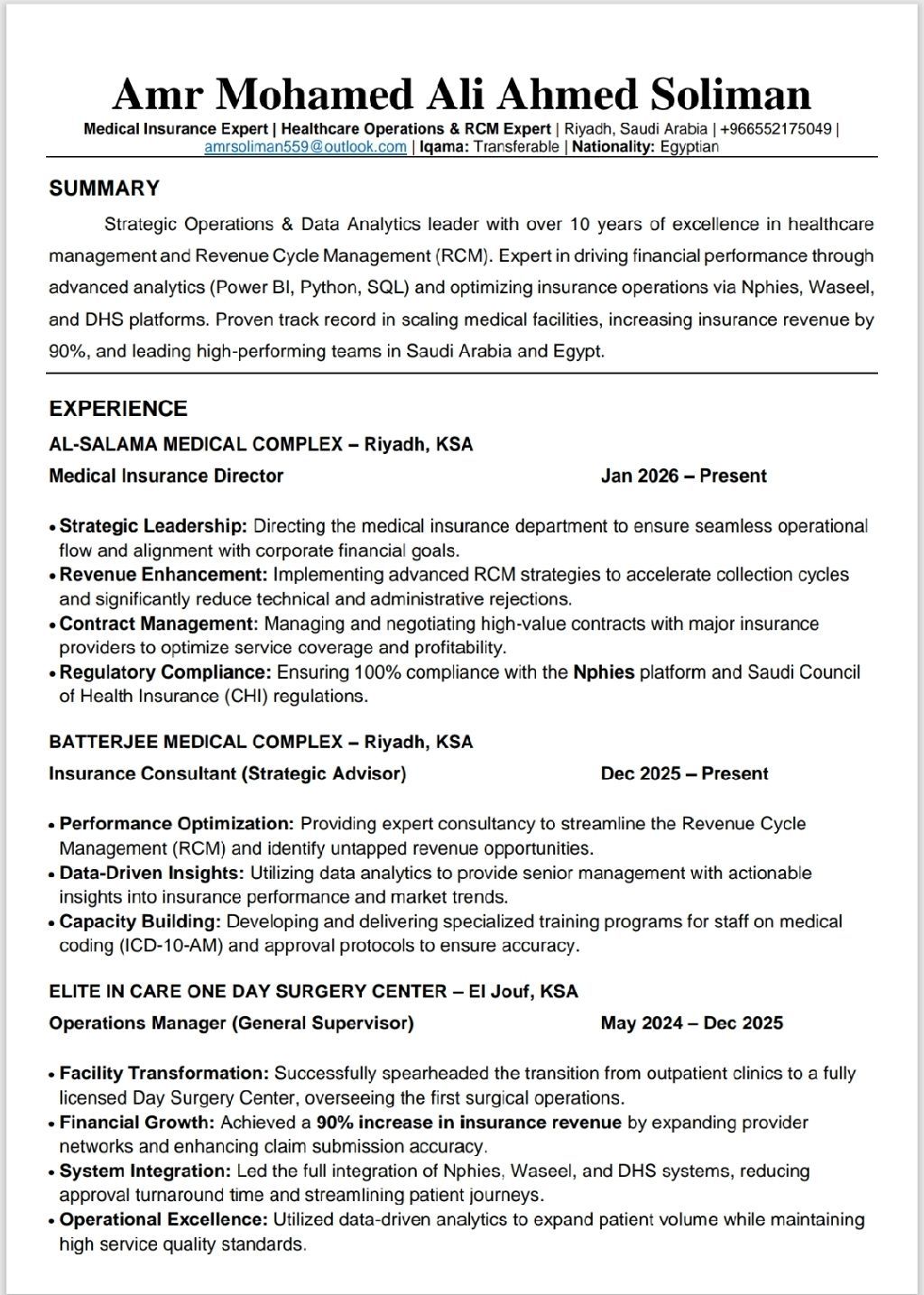 تشغيل، تطوير، تأمين. اعمل بالمجال الطبي وادارة المجمعات الطبية أكثر من 9 سنوات ولدي خبرة كبيرة بالتأمين وزيادة الدخل ورفع كفاءة طاقم الموظفين