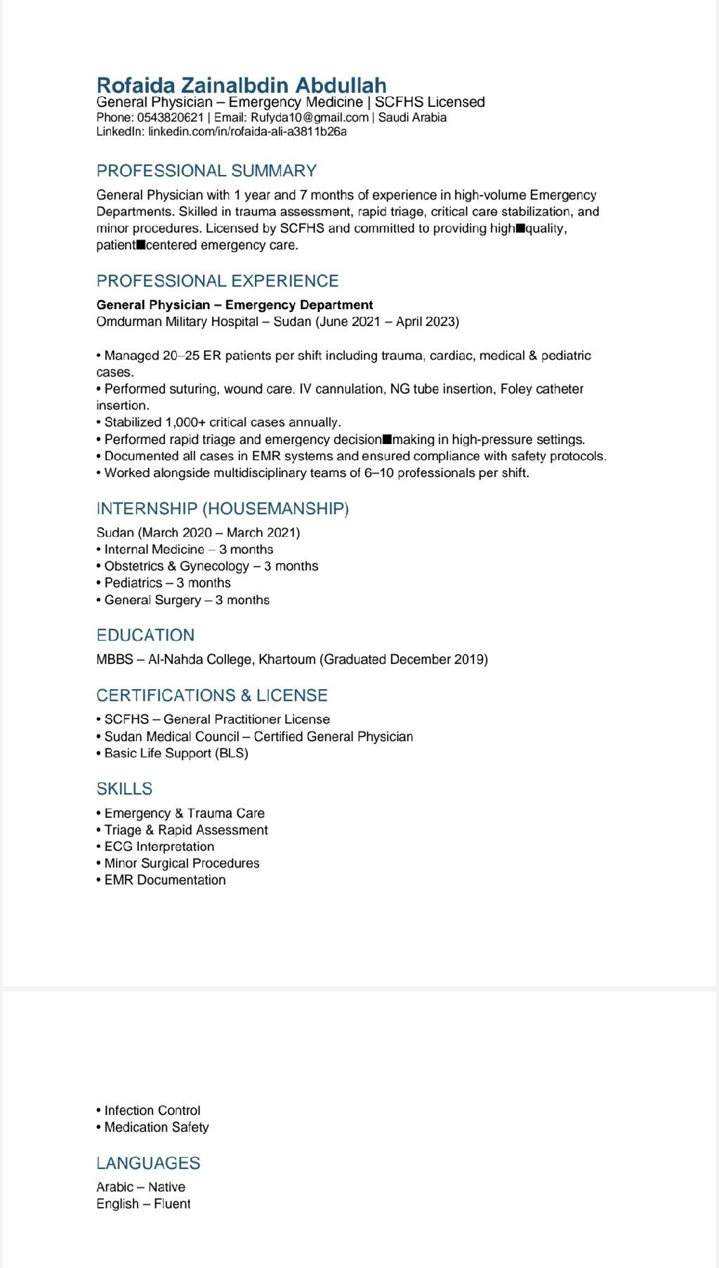 طبيبة عمومية حاصلة على تصنيف الهيئة السعودية للتخصصات الصحية، ولدي خبرة عملية في قسم الطوارئ لمدة سنة و7 أشهر ولدي اقامة قابلة للنقل. أتطلع للحصول على فرصة عمل طبيبة عمومية لأقدم خبرتي ومهاراتي الطبية في خدمة المرضى والمجتمع