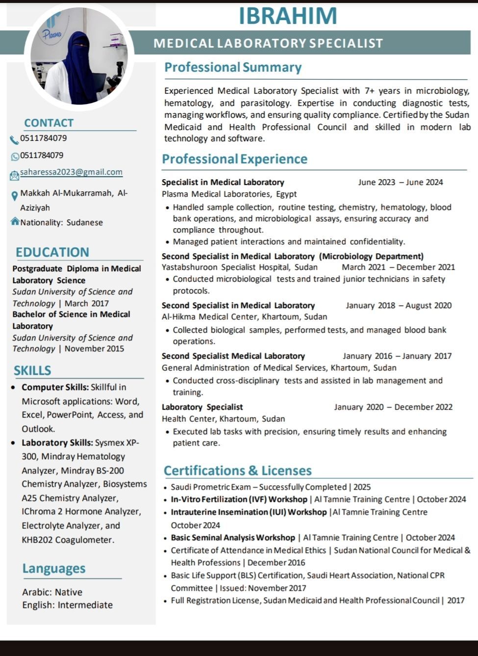 Medical Laboratory Specialist with 7 years of experience, licensed and with valid residency. Expert in sample collection, accurate laboratory analysis, handling modern equipment, ensuring quality and occupational safety standards, and capable of working under pressure
