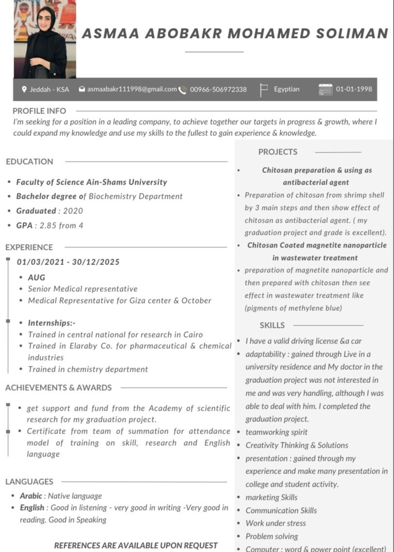 Medical Representative - Looking for Opportunities Hi, I am Asmaa Bakr. I am a motivated and enthusiastic professional looking for a Medical Representative role. I have strong communication skills, a passion for healthcare, and experience in presenting medical products to doctors. I am eager to join a dynamic team and contribute to achieving sales and marketing goals