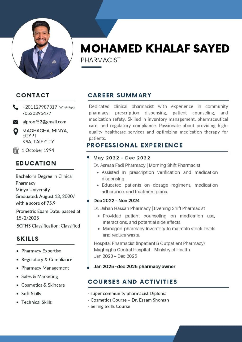 Clinical Pharmacist - Job Seeker Bachelor in Clinical Pharmacy, Minya University (2020) SCFHS Classified + Prometric Passed Experience Hospital & Community Pharmacy - Owner - Patient Counseling & Inventory Management Skills Pharmacy Management, Marketing, Cosmetics Available in Saudi Arabia (Taif)