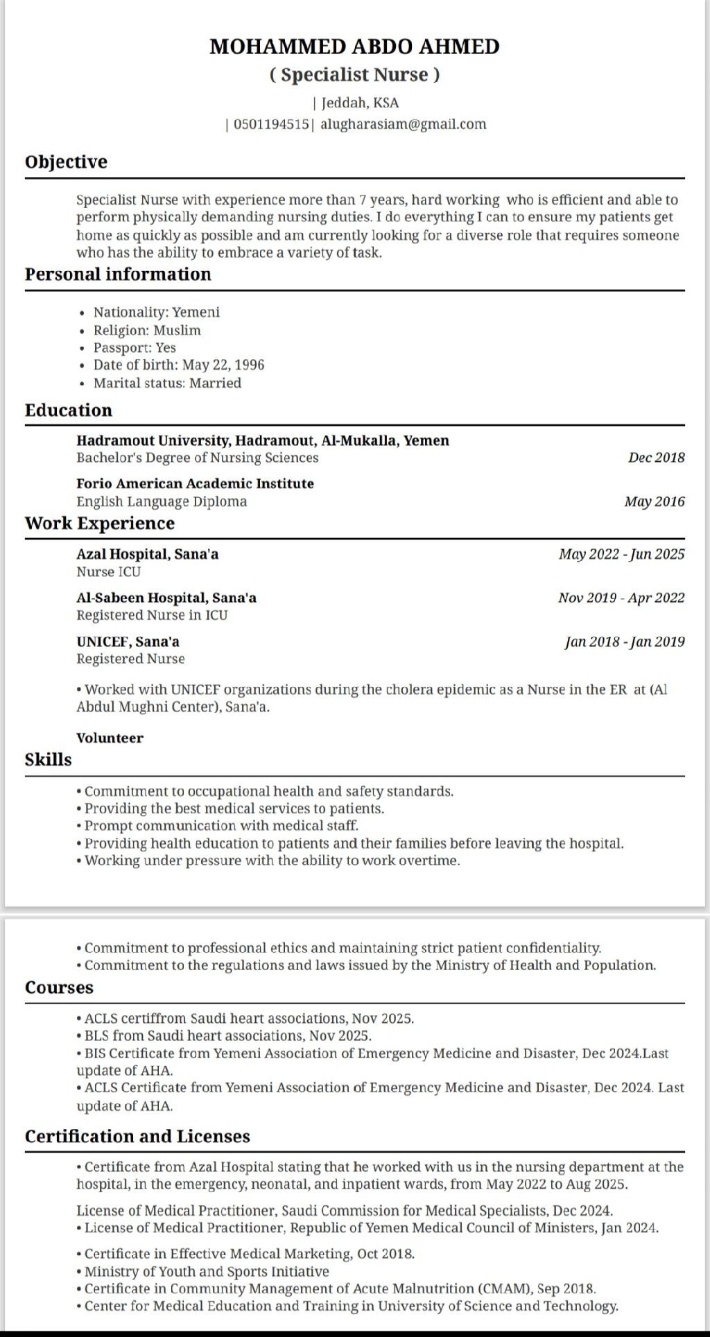 Nursing Specialist licensed by the Saudi Commission for Health Specialties (SCFHS) with solid clinical experience. BLS & ACLS certified - Saudi Heart Association. Transferable Iqama and available for immediate employment