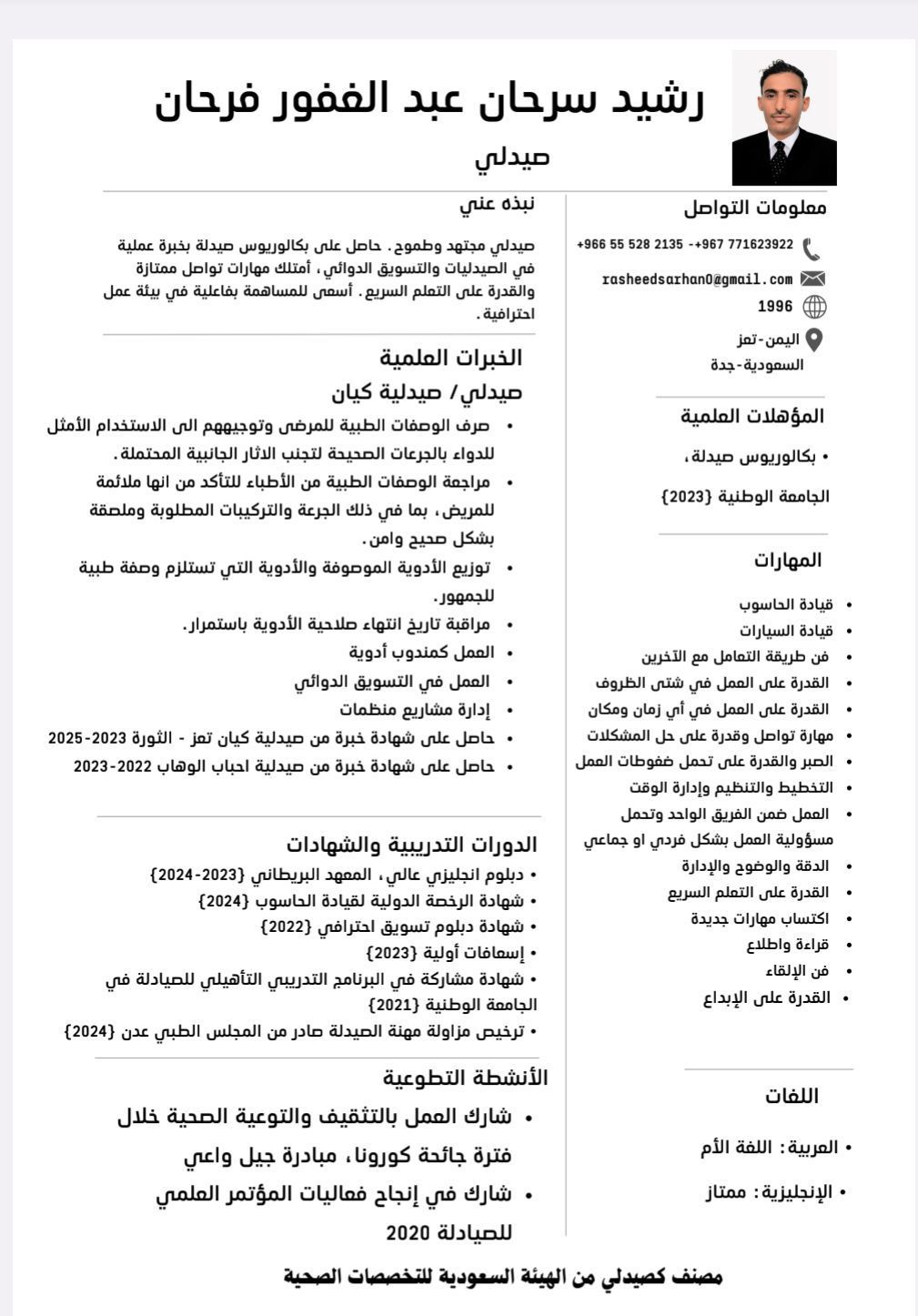 I am a licensed pharmacist in Saudi Arabia with two years of experience in the field and I am looking for an opportunity to grow professionally and contribute positively to your company. I am single and my age is 27 years