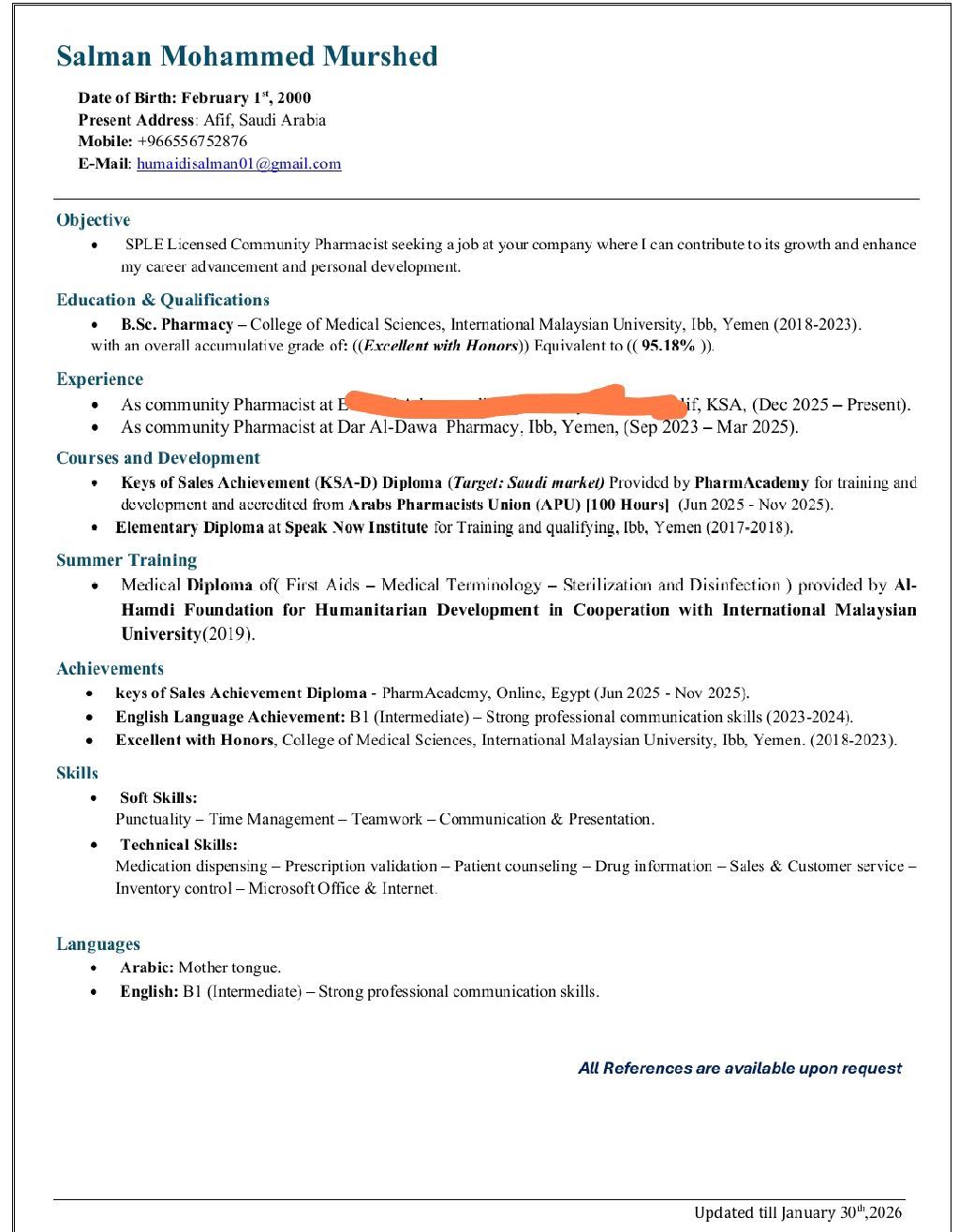 صيدلي يمني العمر 26 سنة حاصل على التصنيف المهني قابل لنقل الكفالة لأول مرة