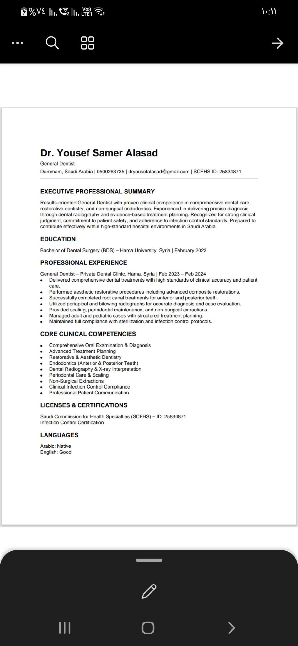 General Dentist - Private Dental Clinic, Hama, Syria Feb 2023 - Feb 2024 Delivered comprehensive dental treatments with high standards of clinical accuracy and patient. care. Performed aesthetic restorative procedures including advanced composite restorations. Successfully completed root canal treatments for anterior and posterior teeth. Utilized periapical and bitewing radiographs for accura