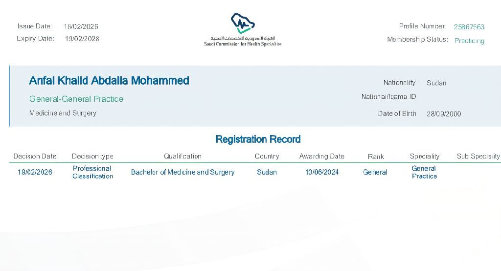I am a General Practitioner with strong academic performance, graduated with distinction from one of the leading universities in Sudan. I have published research in international journals and experience as a trainer for several medical courses in Sudan. I completed a full year of clinical internship at Al Iman Hospital in Riyadh and have solid knowledge in the management of emergency and chronic