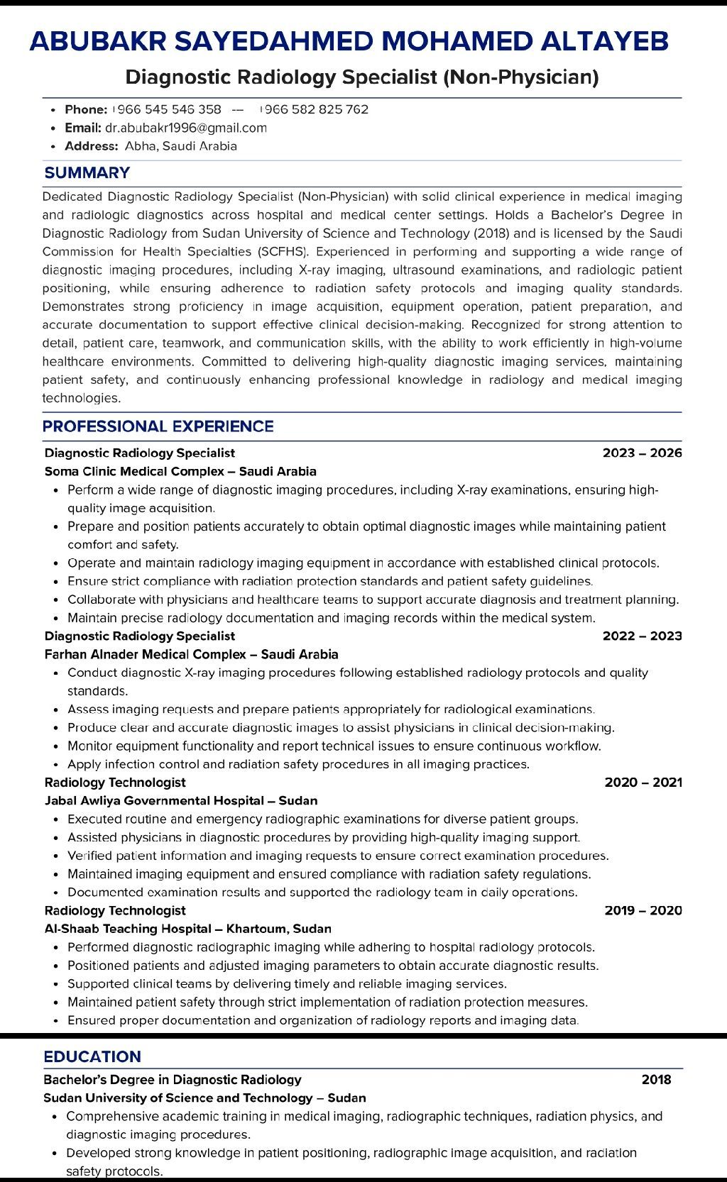 أخصائي أشعة تشخيصيه غير طبيب وحاصل على ترخيص الهيئة السعودية للتخصصات الصحية متوفر نقل فور الاتفاق خبرة في مجال الأشعة أكثر من 4 سنوات داخل وخارج المملكة 4 سنة إقامة سارية أكثر من سنة والمهنة في الإقامة أخصائي أشعة وعندي خبرة في مكافحة العدوى ابحث عن عمل