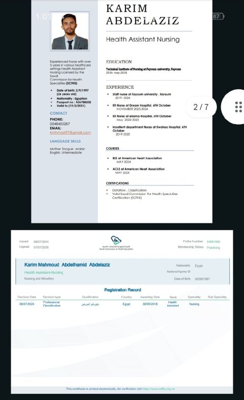 My name is Karim Mahmoud Abdel Hamid Abdel Aziz, a healthcare assistant with one year of experience in home healthcare in the Kingdom. I have five years of experience in the emergency department and one year of experience in dental nursing. I am looking for a job opening. I hold BLS and ACLS certifications