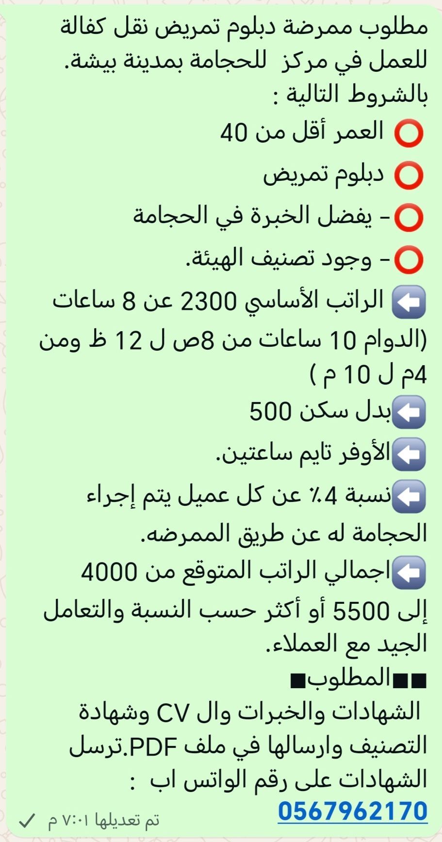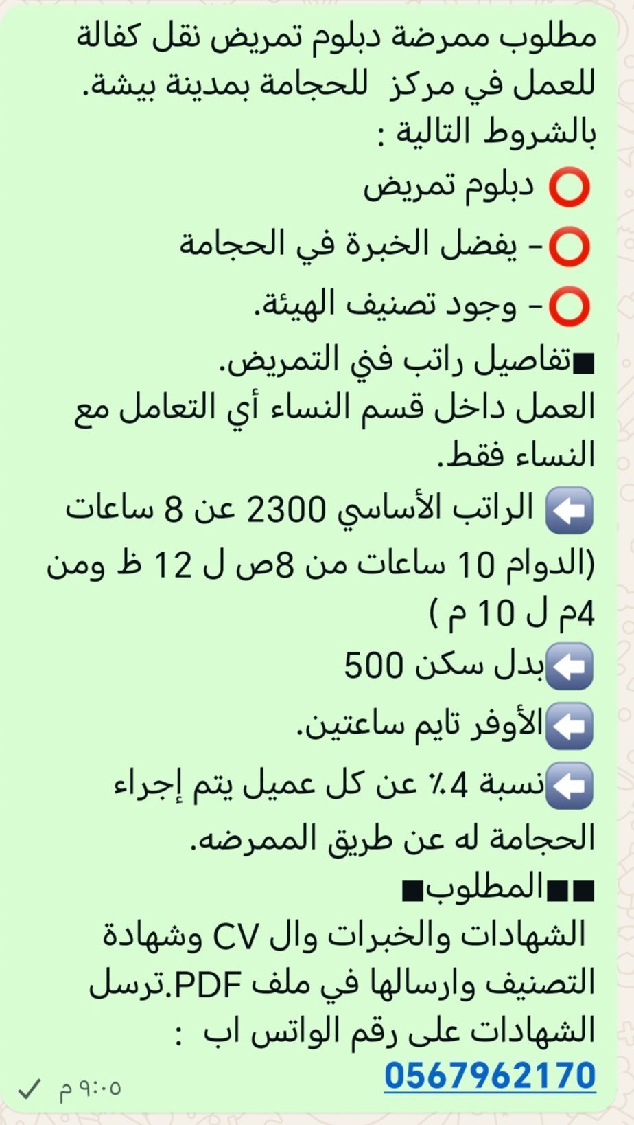 مطلوب ممرضة دبلوم تمريض نقل كفالة للعمل في مركز للحجامة بمدينة بيشة. بالشروط التالية دبلوم تمريض - يفضل الخبرة في الحجامة - وجود تصنيف الهيئة. تفاصيل راتب فني التمريض. العمل داخل قسم النساء أي التعامل مع النساء فقط. الراتب الأساسي 2300 عن 8 ساعات (الدوام 10 ساعات من 8 ص ل 12 ظ ومن 4م ل 10م) بدل سكن 500 الأوفر تايم ساعتين. نسبة 4 عن كل عميل