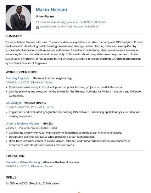 An urban and regional planning engineer specializing in urban development according to Saudi standards, with 12 years of experience including working as a planning engineer and geographic information systems analyst, a member of the Saudi Council of Engineers with a professional degree