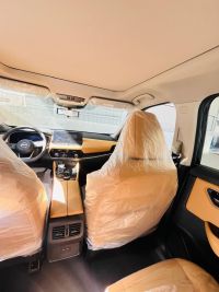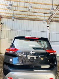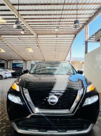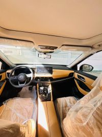 Nissan X-Trail 7-seater SL, full Saudi specifications. Features: 2500cc 4-cylinder gasoline engine, automatic transmission, remote start, front and rear sensors, smart entry, smart start, camel leather seats, blind spot radar, panoramic sunroof, lane departure warning, four-wheel drive, 19-inch chrome wheels, LED headlights, daytime running lights, front fog lights, door handles matching car color, mirror turn signals, rear fog light, LED taillights, rear spoiler.