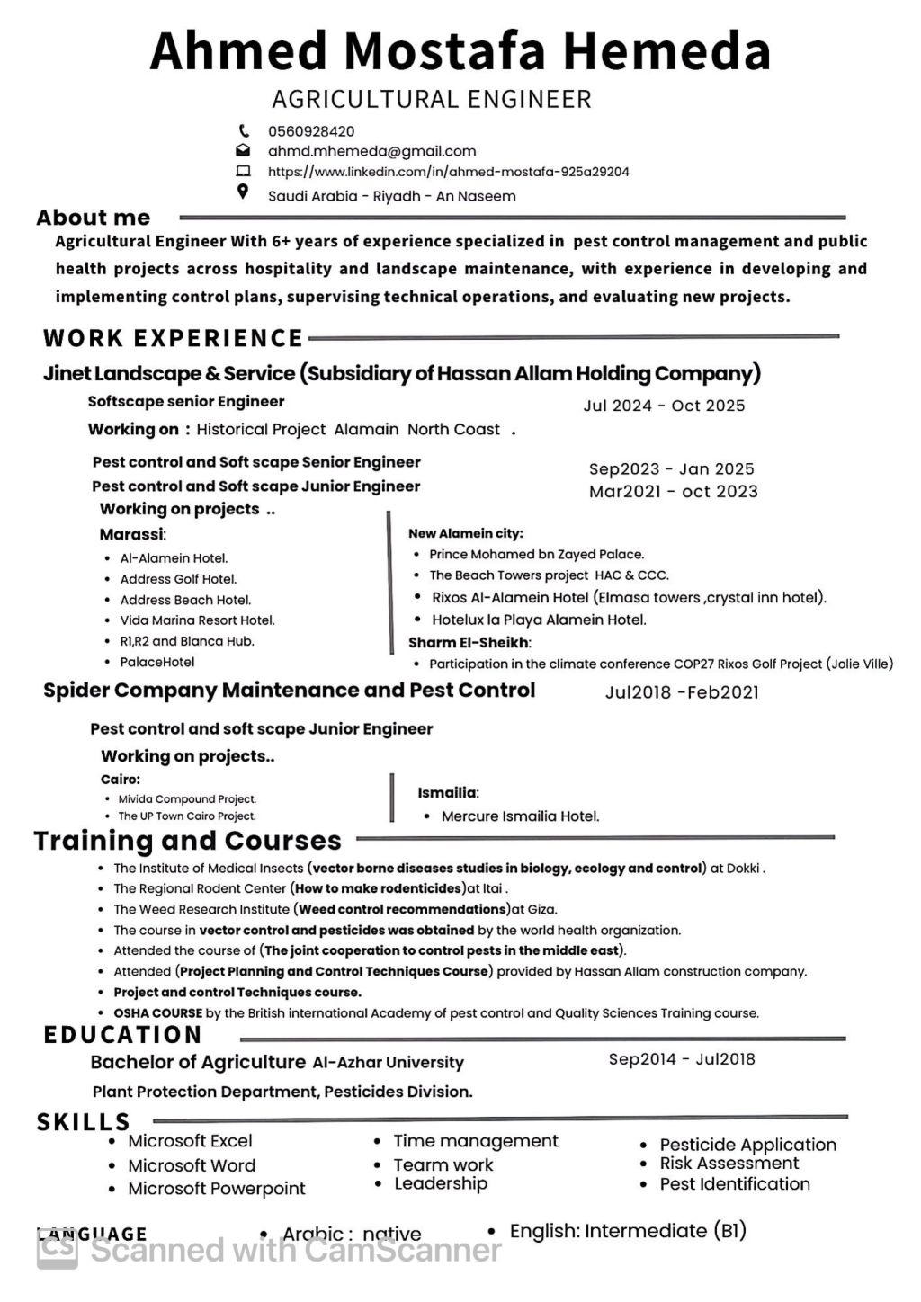 أنا مهندس زراعي متخصص في مكافحة آفات الصحة العامة والآفات الزراعية، تنسق الحدائق ابحث عن فرصة عمل في شركة أو مشروع داخل المملكة. المؤهلات والخبرة بكالوريوس زراعة - تخصص وقاية نبات / شعبة مبيدات. خبرة في الاشراف الميداني وتنفيذ برامج مكافحة الحشرات والقوارض. معرفة جيدة بالمبيدات وأساليب المكافحة الآمنة. القدرة على اعداد التقارير الفنية ومتابعة فرق العمل