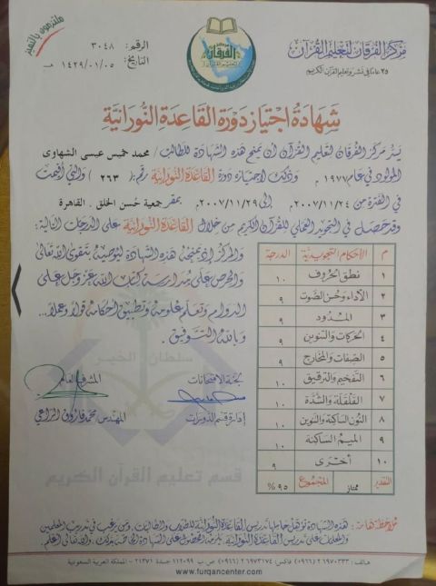 معلم القاعدة النورانية خبرة أكثر من 15 سنة تدريس عرب وأعاجم مختلف الأعمار للوصول لمستوى التميز قراءة النصوص العربية بصفة عامة والقرآن الكريم بصفة خاصة مؤهل عالي شهادات معتمدة