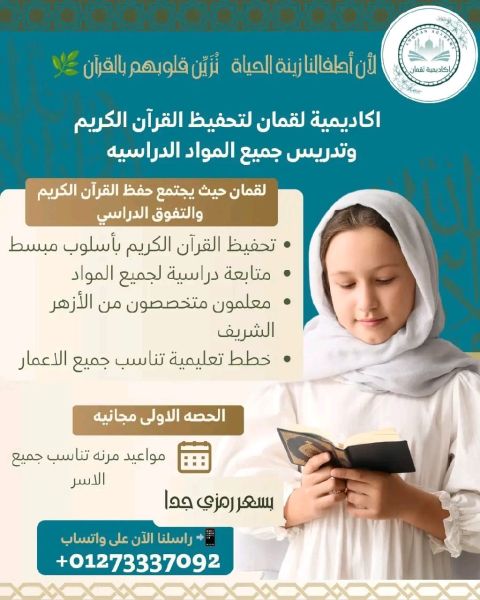 أكاديمية لقمان التعليمية نعلم أبناءنا بالعلم والقرآن. بأسلوب راق ومتميز برامجنا تجمع بين التربية والتعليم 1 تحفيظ القرآن الكريم مع تصحيح التلاوة واحكام التجويد 2 تفسير مبسط للأيات يناسب فهم الاطفال 3 دروس في العقيدة والحديث والسيرة النبوية 4 شرح جميع المواد الدراسية (رياضيات - علوم - انجليزي - وغيرها) 5 خطط فردية تناسب كل الأعمار تعليم اونلاين تفاعلي - شرح مباشر