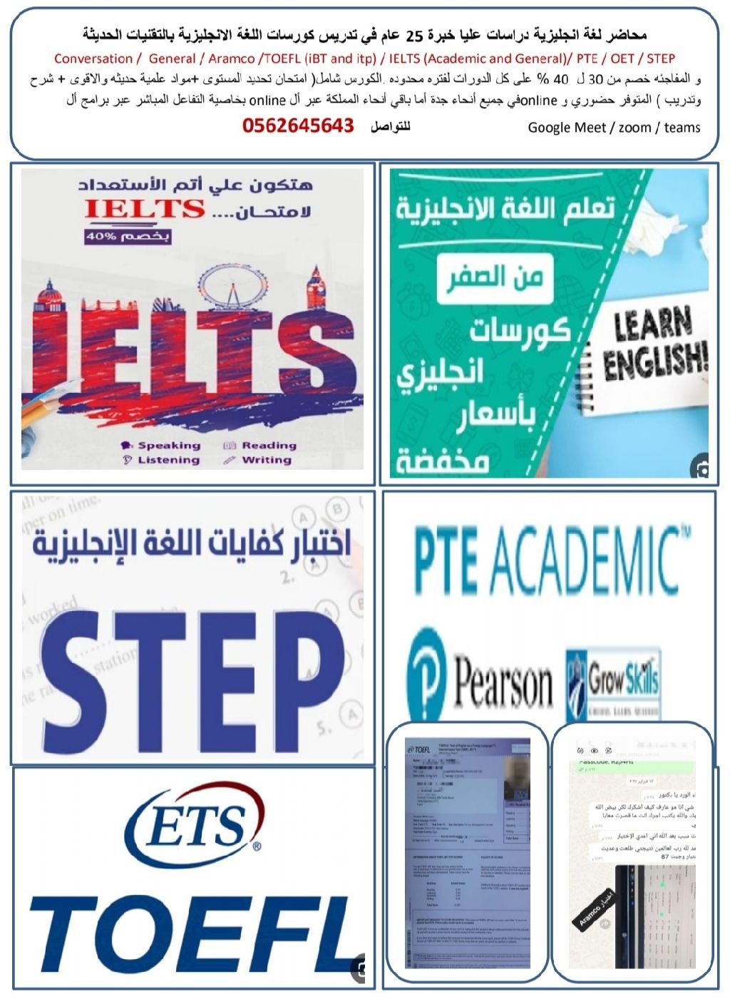 محاضر لغة انجليزية دراسات عليا خبرة 25 عام في تدريس كورسات اللغة الانجليزية بالتقنيات الحديثة Aramco / Conversation/ General/ TOEFL (iBT and itp) IELTS (Academic and General) PTE/ OET/ STEP والمفاجئة خصم من 30 ل 40% على كل الدورات لفترة محدوده الكورس شامل (امتحان تحديد المستوى + مواد علمية حديثة والأقوى + شرح وتدريب) المتوفر حضوري وonline في جميع أنحاء جدة للتواصل