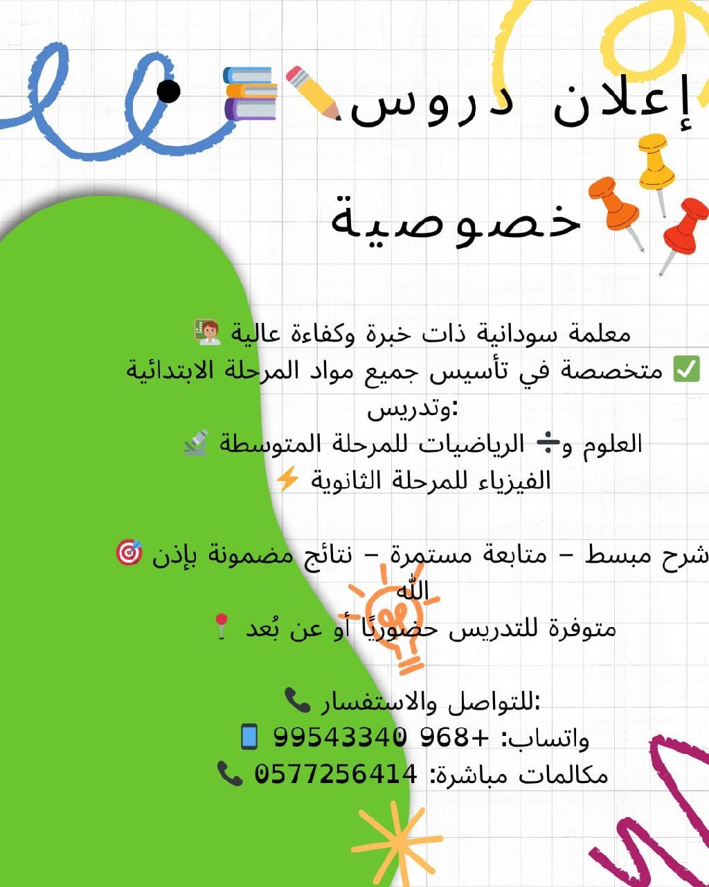 معلمة سودانية ذات خبرة وكفاءة عالية متخصصة في تأسيس جميع مواد المرحلة الابتدائية وتدريس العلوم والرياضيات للمرحلة المتوسطة الفيزياء للمرحلة الثانوية شرح مبسط - متابعة مستمرة - نتائج مضمونة متوفرة للتدريس حضوريا أو عن بعد المكان خميس مشيط - حي الصقور