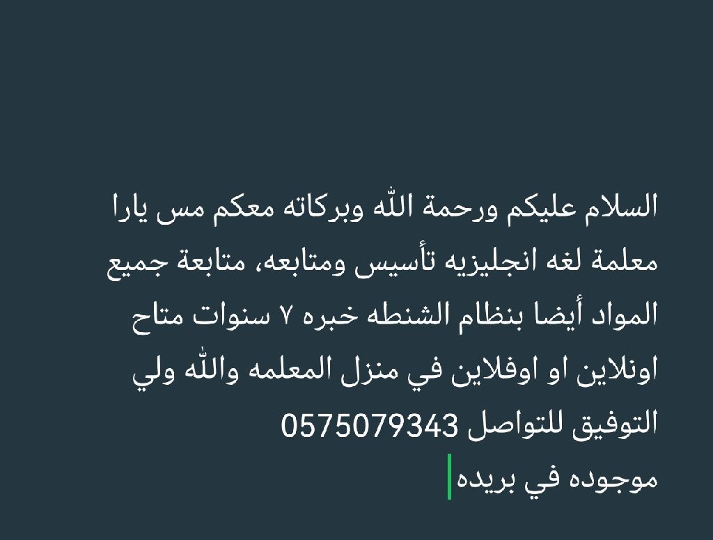 معكم مسيارا معلمة لغة انجليزيه تأسيس ومتابعه، متابعة جميع المواد أيضا بنظام الشنطه خبرة 7 سنوات وأيضا أخصائية تخاطب وتعديل سلوك وتنمية مهارات متاح اونلاين أو أو فلاين في منزل المعلمه